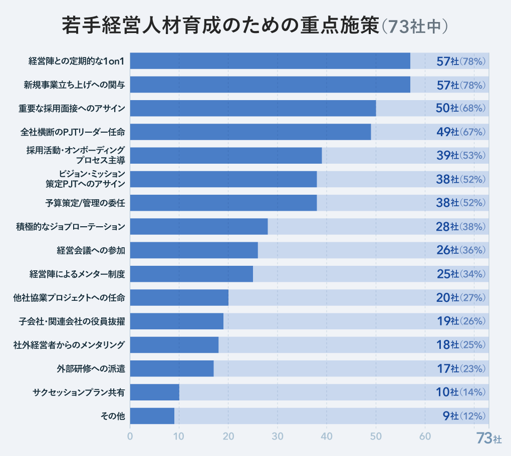 ここまでは想定どおりかもしれないが、今回注目すべきは「経営人材育成プログラム」や「経営人材としての育成対象者を選抜する会議」などの施策を取り入れている企業も、無視できないほど(6社、約8%)に見られた点だ。