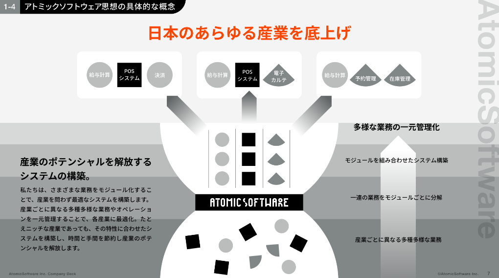 畠中「アトミック」というのは“原子(アトム)”のことです。原子は物質を構成する最小単位で、組み合わせによってあらゆるものが形づくられていますよね。私たちはその考え方をソフトウェアに応用しています。つまり、世の中のシステムを最小単位まで分解してモジュール化し、そのモジュールを組み合わせることで産業ごとに最適なシステムを構築していく。こうした思想を「アトミックソフトウェア思想」と呼んでいます。