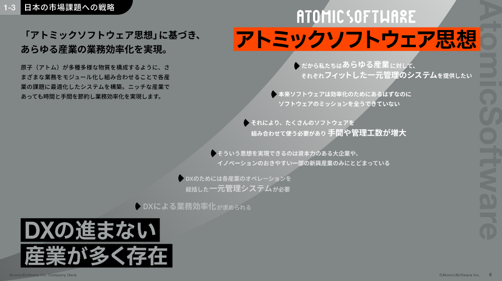 2つの産業で結果を残し、これまでの主戦場であった「メディカル」という言葉を削ぎ落としたアトミックソフトウェア社は、その名の通りこれから幅広い専門産業に「原子」として入り込み、産業の変革に取り組もうとしている。