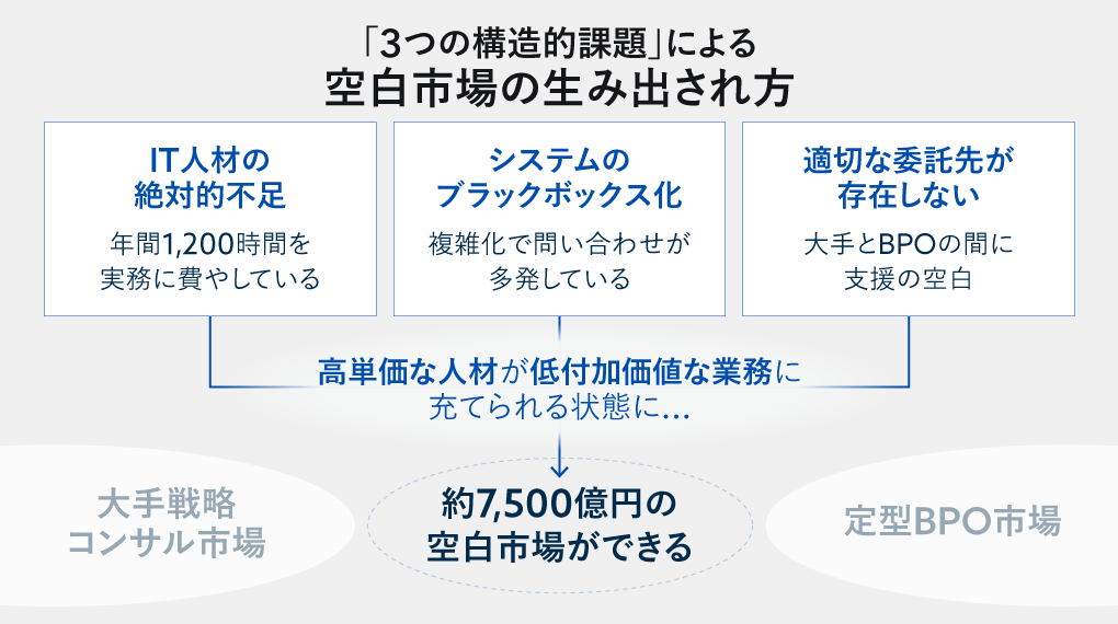 これらの日常業務を外部に委託できれば、IT戦略の立案やDX推進といった本来の業務に集中できるが、ここに市場の構造的な問題が立ちはだかる。既存の大手コンサルティングファームは数億円規模の大型案件を中心に展開しており、数十万円から数百万円規模の小規模業務は収益構造上、対応領域外となっている。一方、IT人材派遣やBPOサービスは定型的な業務には対応できるものの、IT戦略に関わる高度な実務支援には対応できない。