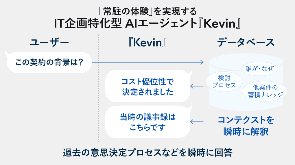 最後に第3のアプローチ、IT企画業務特化のAIエージェント『Kevin』である。これは、Entaarデータベースに蓄積されたナレッジをAIで活用し、ユーザーに対して意思決定支援やタスクの要件整理、進め方のサジェッションを提供する。『Kevin』は過去の意思決定の経緯を瞬時に解明し、「常駐の体験を実現する」AIエージェントだ。