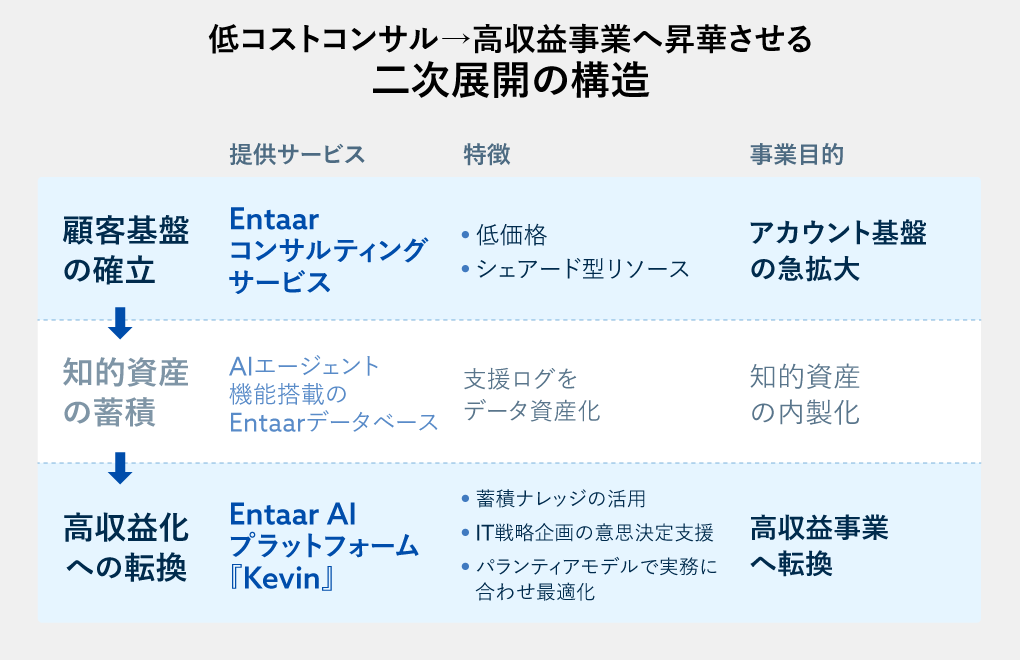 さらに重要なのが、Entaarの事業戦略の構造だ。同社は、コスト競争力のあるサービスでアカウントを広げ、そのアカウント基盤に高収益な事業を展開する「二次展開の構造」を設計している。