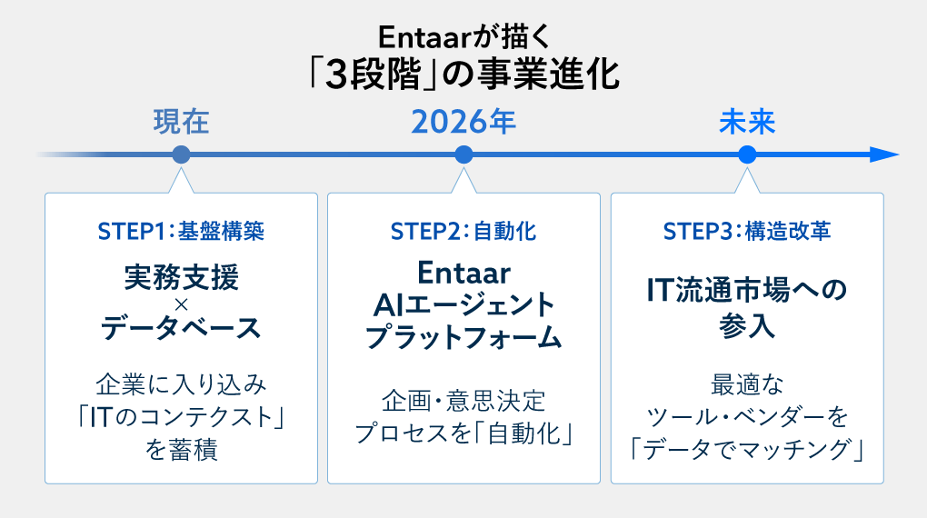 Entaarは、現在のITコンサルティング市場に続き、今後は流通市場など、それぞれの領域に1兆円プレーヤーがいる巨大な市場のアップデートを図っていく構想である。具体的には、2026年にIT企画業務特化のAIエージェントをリリースし、同時期にIT流通市場への参入とITマーケットプレイス事業のローンチを計画している。