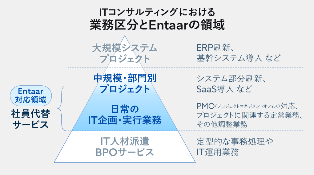 一方、IT人材派遣会社やBPO企業にとっては、Entaarが提供する「IT戦略に関わる高度な実務支援」は専門性が高すぎる。彼らのビジネスモデルは「定型業務の代行」であり、企業ごとにカスタマイズされた戦略支援を提供する体制を持たない。