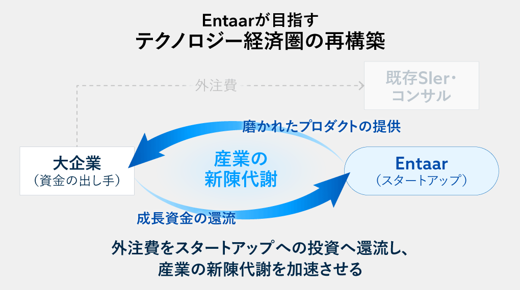 大企業の予算がスタートアップに流れれば、スタートアップはトラクションと売上を獲得し、成長資金を得てプロダクトを磨き上げる。そのプロダクトを大企業が継続的に活用することで、新陳代謝が促進される──。Entaarは、大企業とスタートアップをつなぐ「ハブ」となることで、このエコシステムを生み出そうとしている。