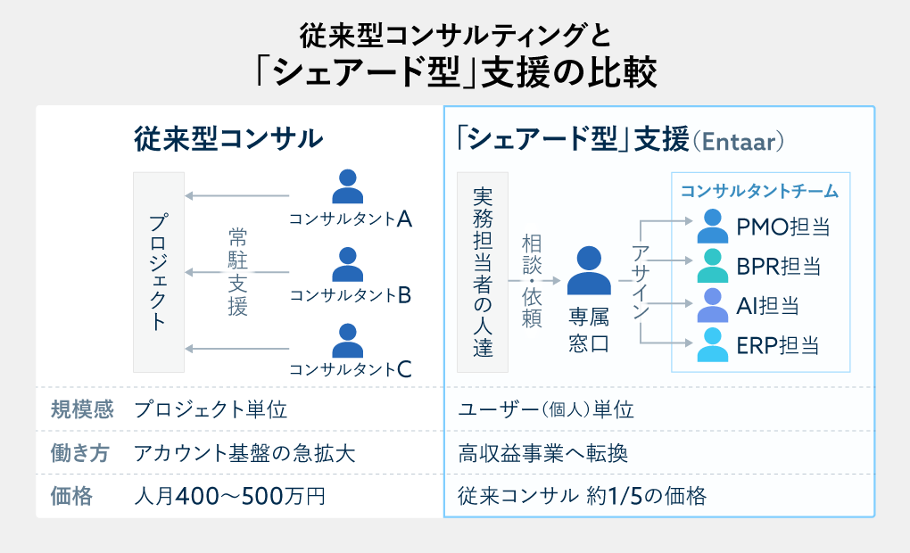 第1のアプローチが、『Entaarコンサルティングサービス』である。これは、ITコンサル人材のリソースを、企業単位ではなくユーザー(顧客企業内の社員個人)単位で提供するサービスだ。従来のコンサルティングが「人」を専属で送り込むのに対し、Entaarは必要な業務に必要な分だけコンサルタントを提供する。