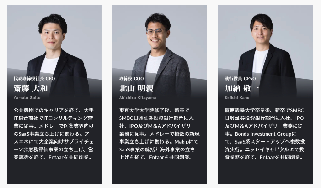 この戦略を実行するEntaarの経営陣もまた、極めて独特である。代表の齋藤氏は、元消防官という異色の経歴を持つ人物。公務員のキャリアを経て、大手IT総合商社にてITコンサルティング営業に従事した後、メドレーで医薬業界向けのSaaS事業立ち上げに携わった。その後、アスエネでは大企業向けの非財務情報開示におけるESG評価事業の立ち上げ及び営業統括を経験している。