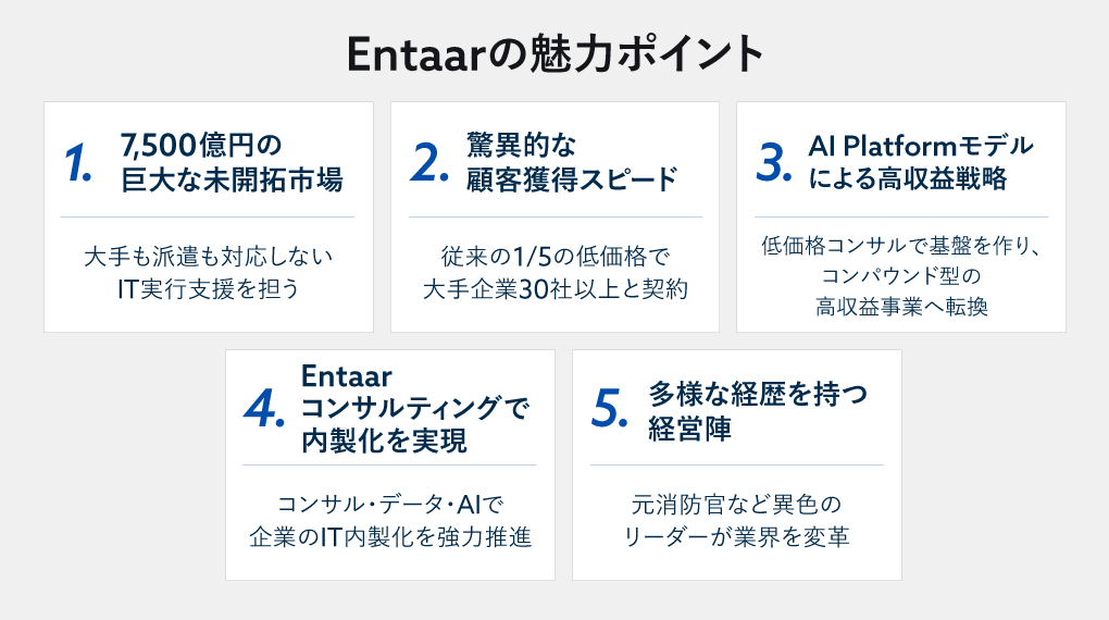 この3つの課題が重なることで生まれたのが、約7,500億円規模の空白の市場である。「コンサル」と「定型BPO」の間の領域に、適切な人材を適切な価格で提供できるプレイヤーが不在だった。Entaarは、まさにこの空白の市場に切り込むスタートアップなのである。