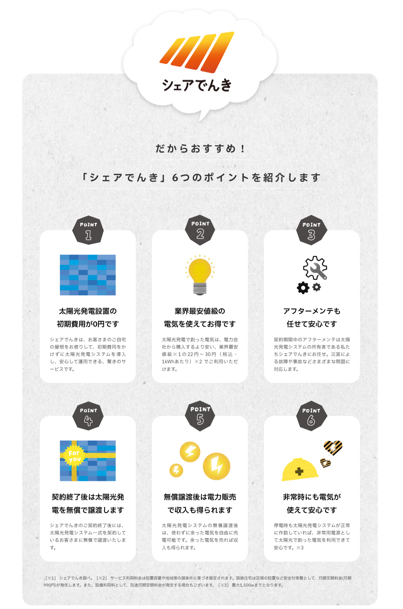「シェアでんき」は、初期費用ゼロで太陽光発電システムを設置し、お得な料金で電気を利用できるPPA(電力販売契約)モデルを展開しています。契約期間中の保守・メンテナンスは所有者であるシェアリングエネルギーがすべて担うため、ユーザー様に手間や費用をかけることなく手軽に再生可能エネルギーを取り入れ、その普及を加速させることができます。