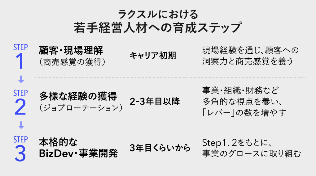 新卒で「BizDevになりたい」「事業開発がしたい」という声も聞きますが、顧客理解・現場理解なくしていきなりできるものではありません。ラクスルでは、1年目から事業開発の機会を約束するのではなく、まず顧客と向き合う経験を積み、3年後に事業開発ができるようになる、というアプローチを重視しています。