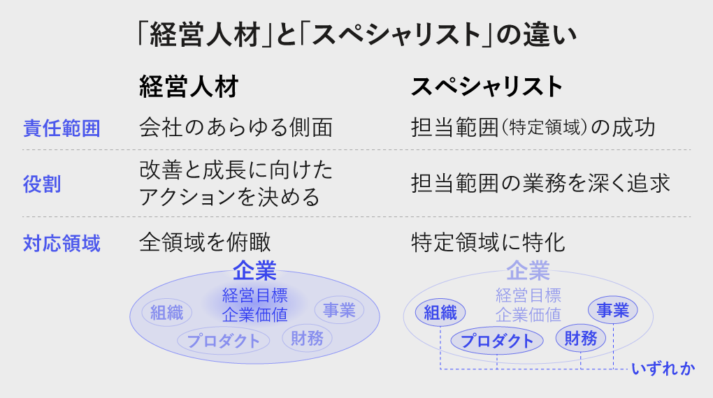 もちろん、自分の担当範囲の成功だけを考えるスペシャリストも会社には必要です。しかし、経営人材と呼ぶべき人々は、常に会社全体の状況を俯瞰して、新しい意思決定を続けていく必要性がある。スペシャリストとは全く異なる存在だと思います。