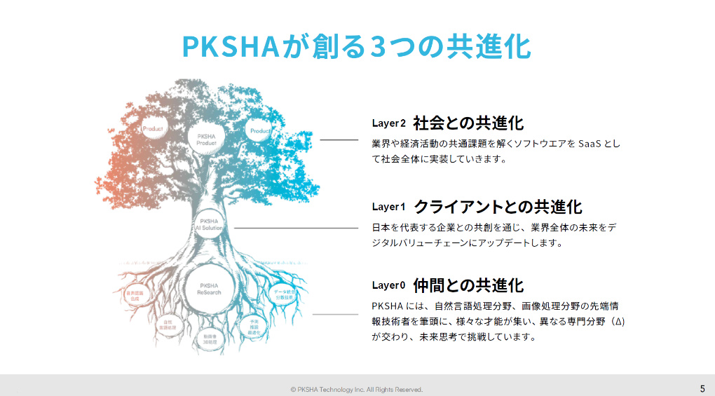 こうした時代を勝ち抜いていくためには、AIを活用することだけに固執せず、AIと人が共に成長し続ける思考が必要になる。AIと人が共に進化する時代なのだ。そして、これを2012年の創業以来から言い続け、他事業展開による成長を実現してきた先進的なAI企業がある。株式会社 PKSHA Technology(以下、PKSHA)だ。