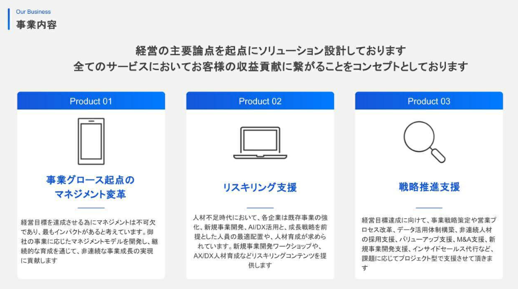 特徴的なのは、「事業」と「組織」という2つの軸でサービスを設計している点にある。事業戦略の立案や営業組織の仕組みづくりといった「事業軸」の支援と、マネージャー育成や組織開発といった「組織軸」の支援を、顧客の課題に応じて組み合わせていく。山田氏が4社で培ってきた「事業を数式で捉える力」と「人を動かす力」、その両方を体系化したプログラムと言える。