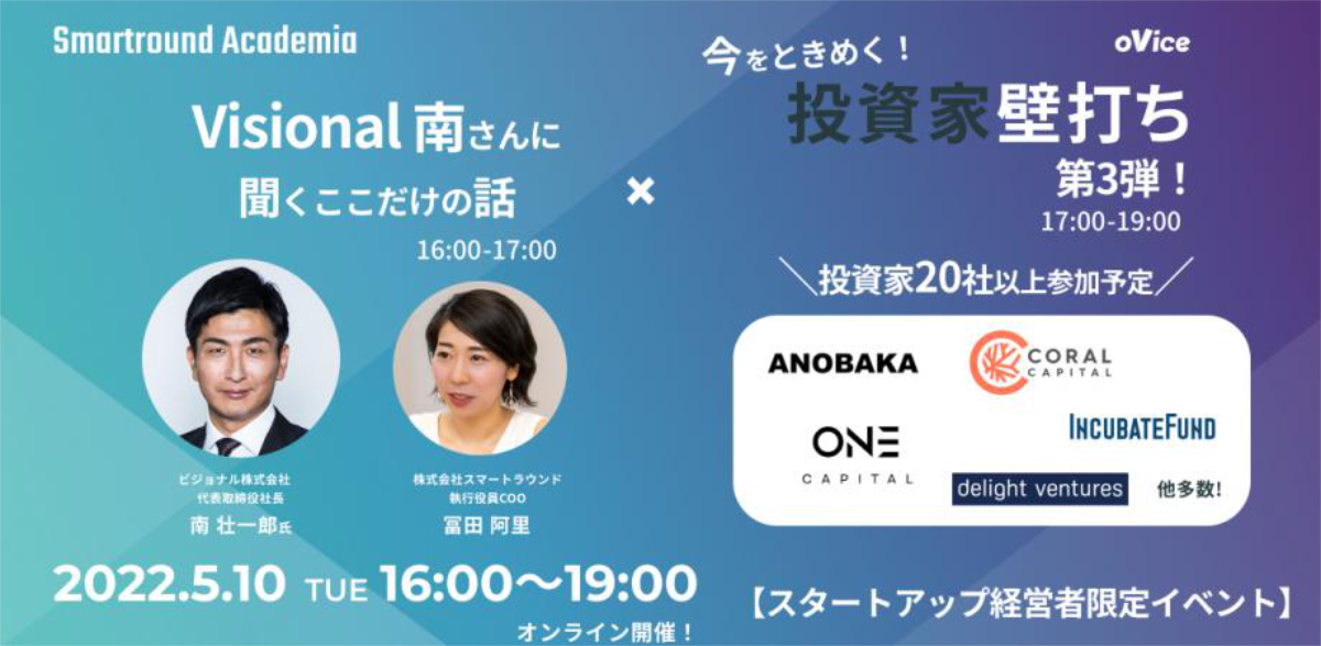 【5/10開催】Smartround Academia スタートアップ経営者限定!『Visional 南さんに聞くここだけの話』 &『今をときめく!投資家壁打ち第3弾』