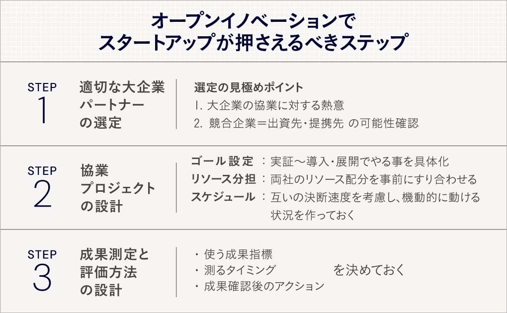 スタートアップがオープンイノベーションにチャレンジする際、必ず押さえるべき3つのステップを見ていこう。